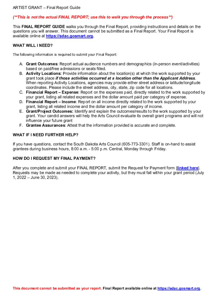 ARTIST GRANT Final Report Guide (**This is not the actual FINAL REPORT; use this to walk you through the process**) This FINAL REPORT GUIDE walks you through the Final Report, providing instructions