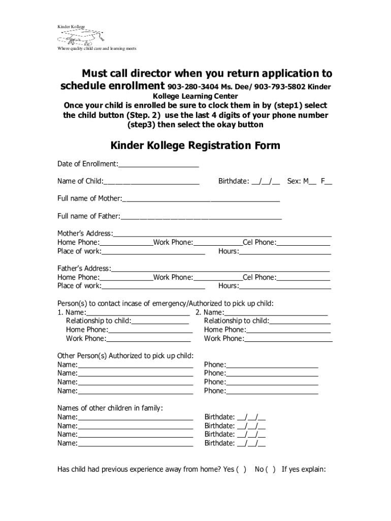 Obtain an enrollment form from Kinder Kollege Learning Center.