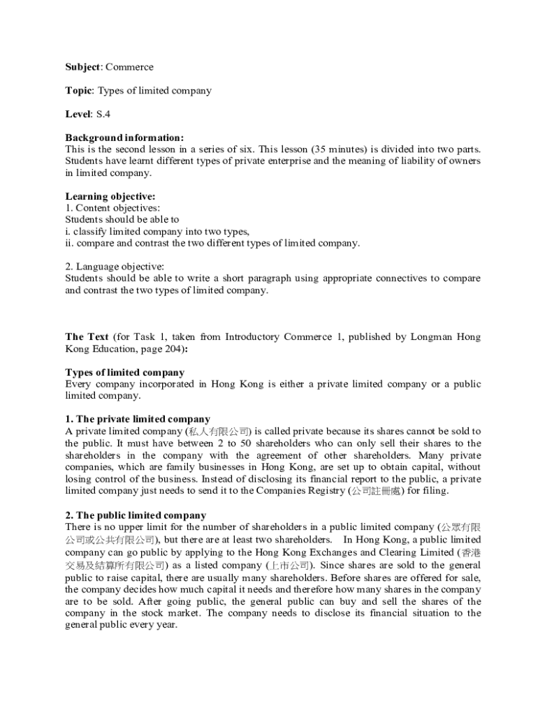 Subject: Commerce Topic: Types of limited company Level: S.4 Background information: This is the second lesson in a series of six. This lesson (35 minutes) is divided into two parts. Students have