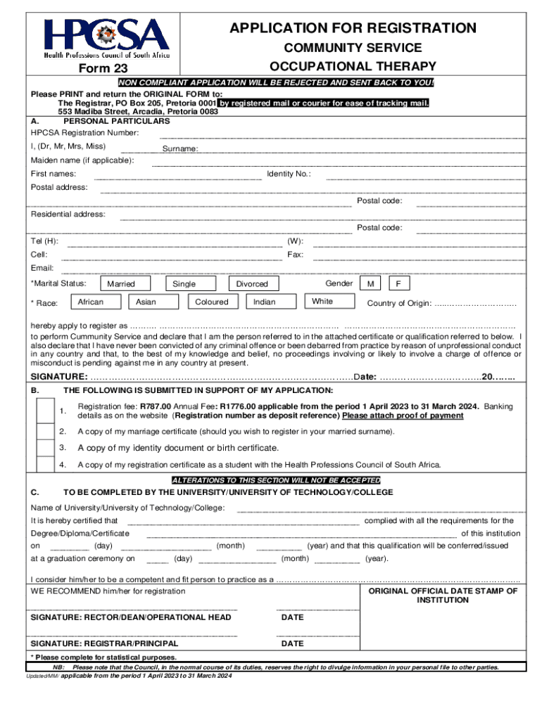 APPLICATION FOR REGISTRATION COMMUNITY SERVICE OCCUPATIONAL Thermoform 23NON COMPLIANT APPLICATION WILL BE REJECTED AND SENT BACK TO YOU! Please PRINT and return the ORIGINAL FORM to: The Registrar,