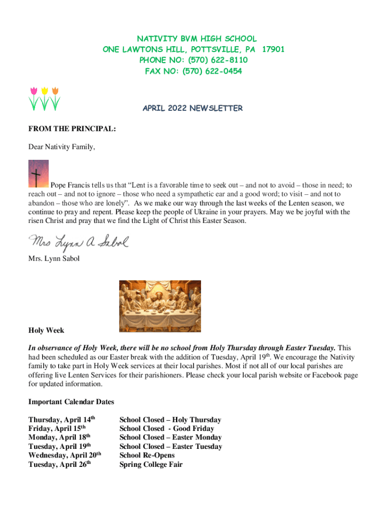 NATIVITY BVM HIGH SCHOOL ONE LAWTON HILL, POTTSVILLE, PA 17901 PHONE NO: (570) 6228110 FAX NO: (570) 6220454APRIL 2022 NEWSLETTER FROM THE PRINCIPAL: Dear Nativity Family, Pope Francis tells us that