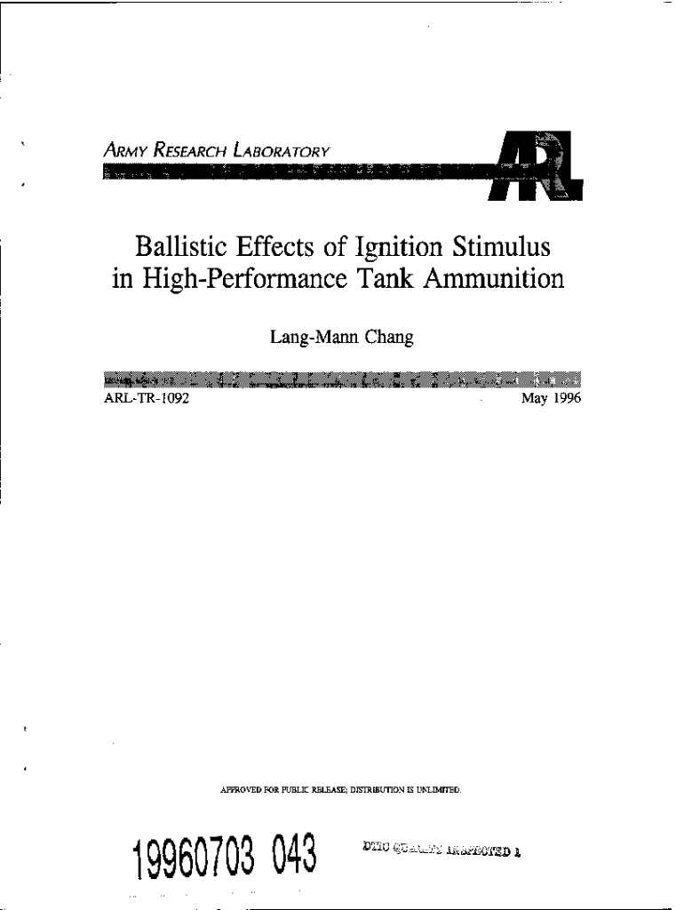 ARMY RESEARCH LABORATORYBallistic Effects of Ignition Stimulus in HighPerformance Tank Ammunition Lang Mann Chang May 1996ARLTR1092APPROVED FOR PUBLIC RELEASE; DISTRIBUTION IS UNLIMITED.19960703 043Mil!