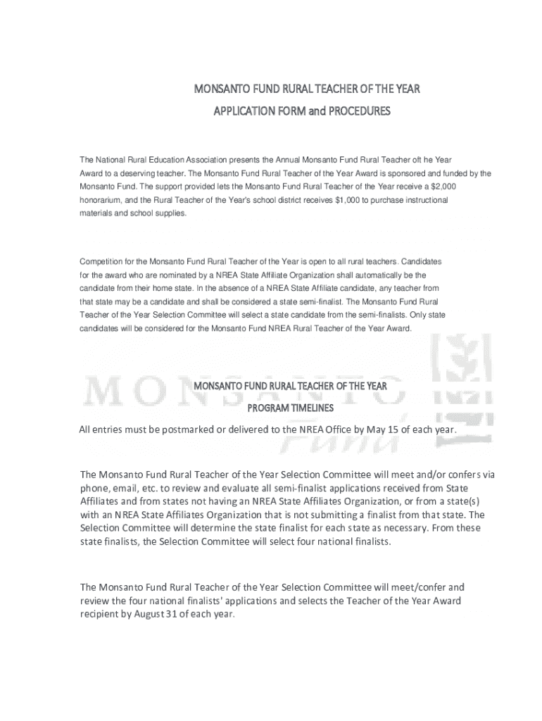 MONSANTO FUND RURAL TEACHER OF THE YEAR APPLICATION FORM and Procedures National Rural Education Association presents the Annual Monsanto Fund Rural Teacher of the Year Award to a deserving teacher.