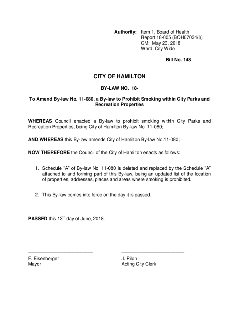 Authority: Item 1, Board of Health Report 18005 (BOH07034(l)) CM: May 23, 2018, Ward: City Wide Bill No. 148CITY OF HAMILTON BYLAW NO. 18To Amend Bylaw No. 11080, a Bylaw to Prohibit Smoking within