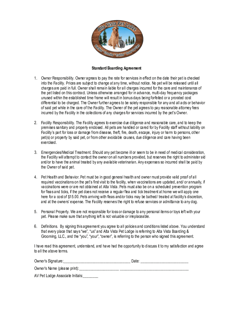 Standard Boarding Agreement 1. Owner Responsibility. Owner agrees to pay the rate for services in effect on the date their pet is checked into the Facility. Prices are subject to change at any time,