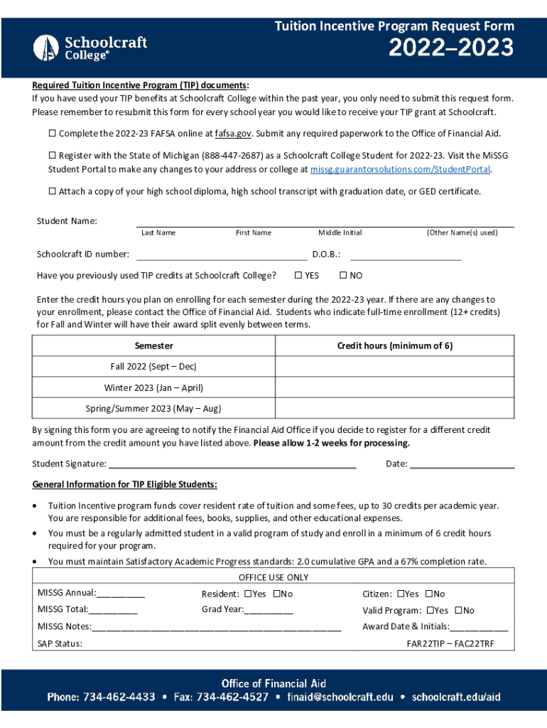 Tuition Incentive Program Request FormRequired Tuition Incentive Program (TIP) documents: If you have used your TIP benefits at School craft College within the past year, you only need to submit this