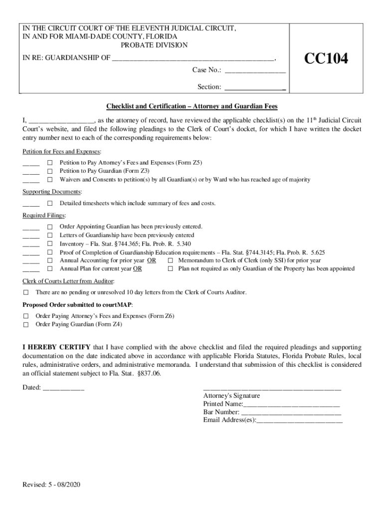 IN THE CIRCUIT COURT OF THE ELEVENTH JUDICIAL CIRCUIT, IN AND FOR MIA MIDADE COUNTY, FLORIDA PROBATE DIVISIONCC104IN RE: GUARDIANSHIP OF ___, Case No.: ___ Section:_Checklist and Certification Attorney