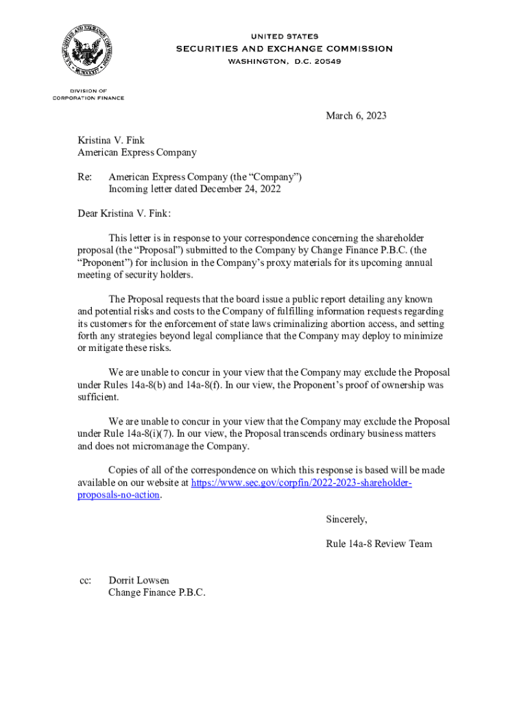 March 6, 2023, Kristina V. Fink American Express Company Re:American Express Company (the Company) Incoming letter dated December 24, 2022Dear Kristina V. Fink: This letter is in response to your