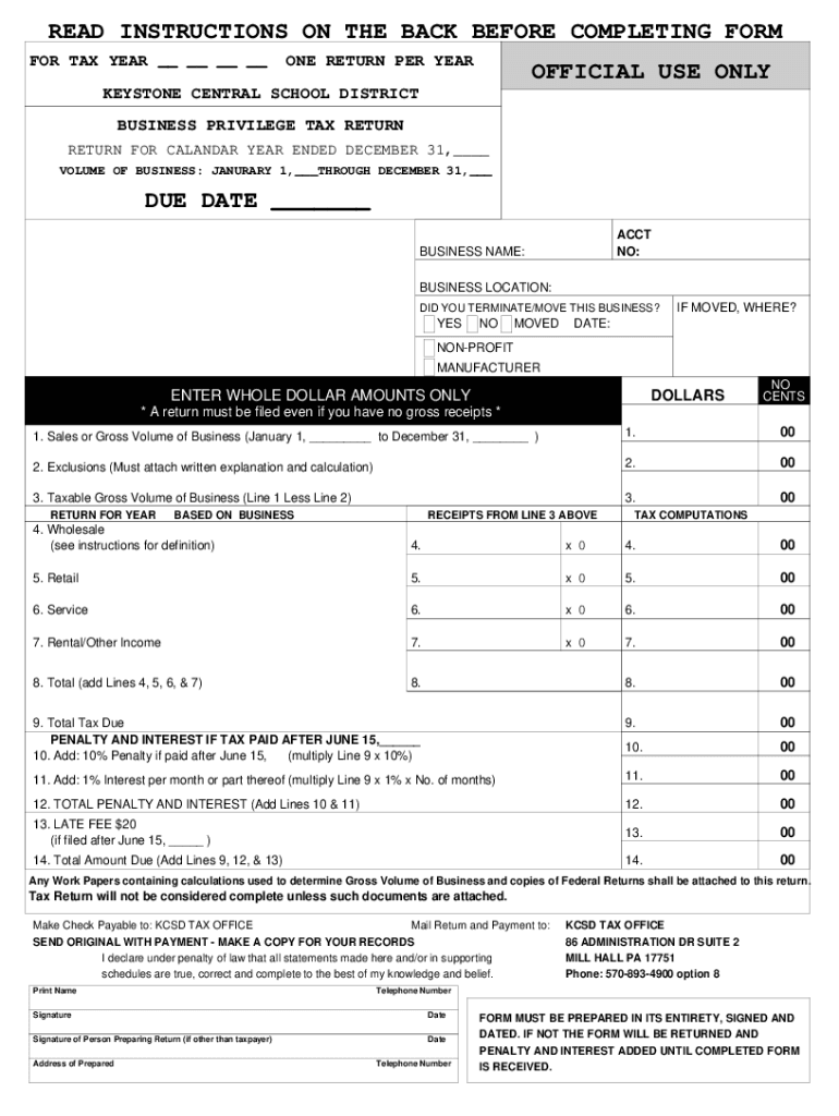 READ INSTRUCTIONS ON THE BACK BEFORE COMPLETING FORM FOR TAX YEAR __ __ __ __ONE RETURN PER SEMIOFFICIAL USE ONLYKEYSTONE CENTRAL SCHOOL DISTRICT BUSINESS PRIVILEGE TAX RETURN FOR CALENDAR YEAR ENDED