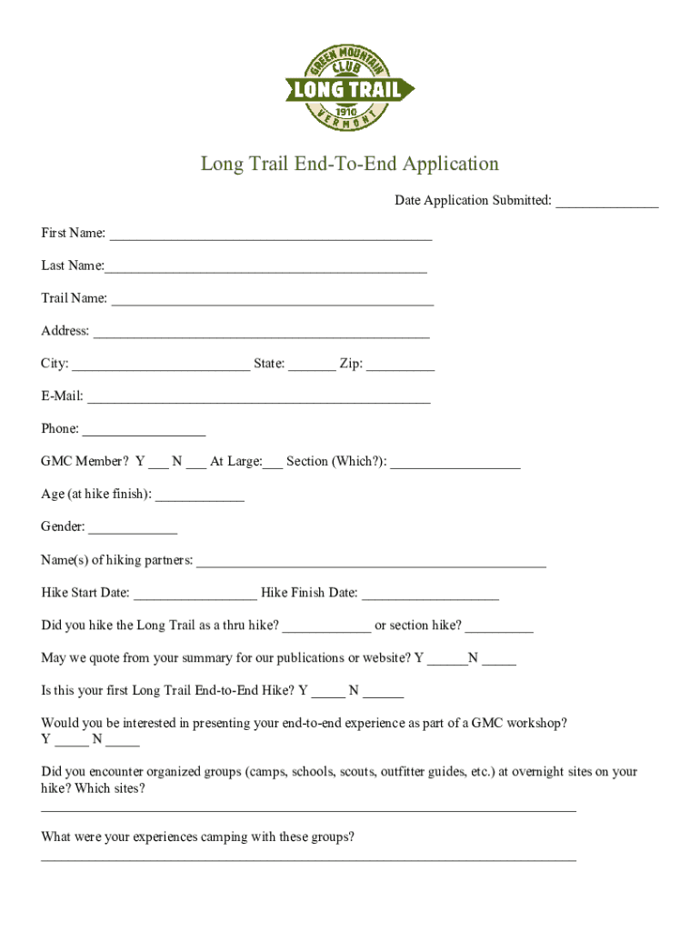 Long Trail Ended Application Date Application Submitted: ___ First Name: ___ Last Name:___ Trail Name: ___ Address: ___ City: ___ State: ___ Zip: ___ Email: ___ Phone: ___ GMC Member? Y ___ N ___