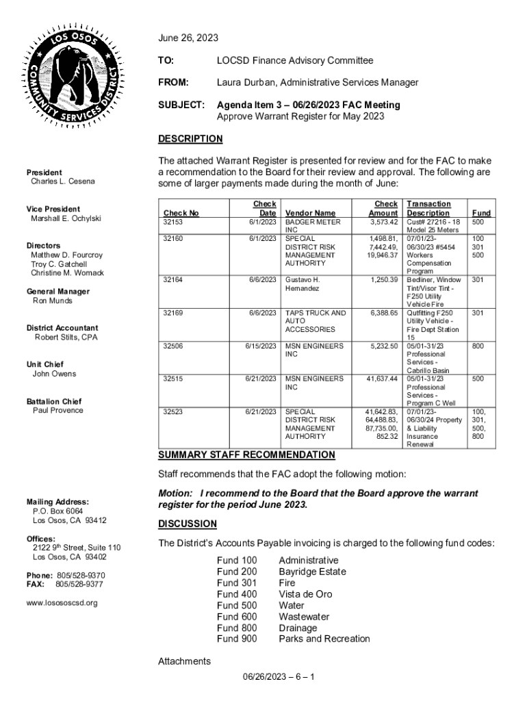 June 26, 2023, TO:LOC SD Finance Advisory CommitteeFROM:Laura Durban, Administrative Services ManagerSUBJECT:Agenda Item 3 06/26/2023 FAC Meeting Approve Warrant Register for May 2023DESCRIPTION President