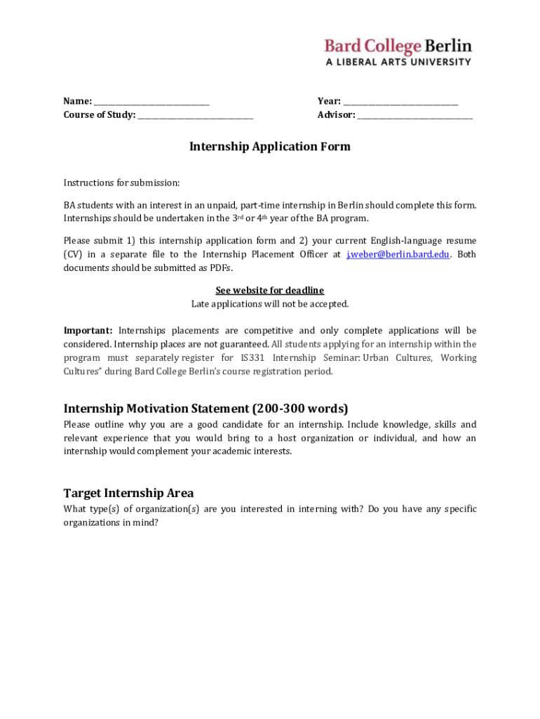 Name: ___ Course of Study: ___Year: ___ Advisor: ___Internship Application Form Instructions for submission: BA students with an interest in an unpaid, part-time internship in Berlin should complete