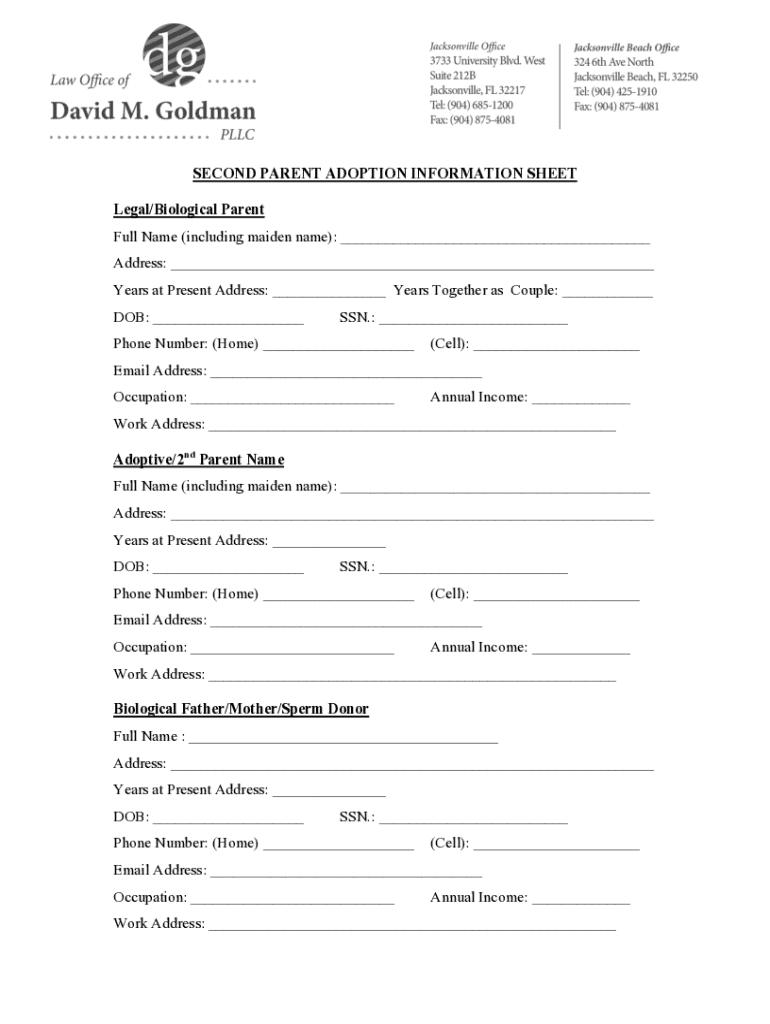 SECOND PARENT ADOPTION INFORMATION SHEET Legal/Biological Parent Full Name (including maiden name): ___ Address: ___ Years at Present Address: ___ Years Together as Couple: ___ DOB: ___SSN.: ___Phone