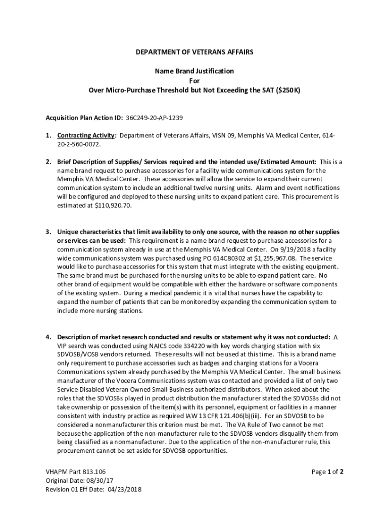DEPARTMENT OF VETERANS AFFAIRS Name Brand Justification For Over MicroPurchase Threshold but Not Exceeding the SAT ($250K)Acquisition Plan Action ID: 36C24920AP1239 1. Contracting Activity: Department
