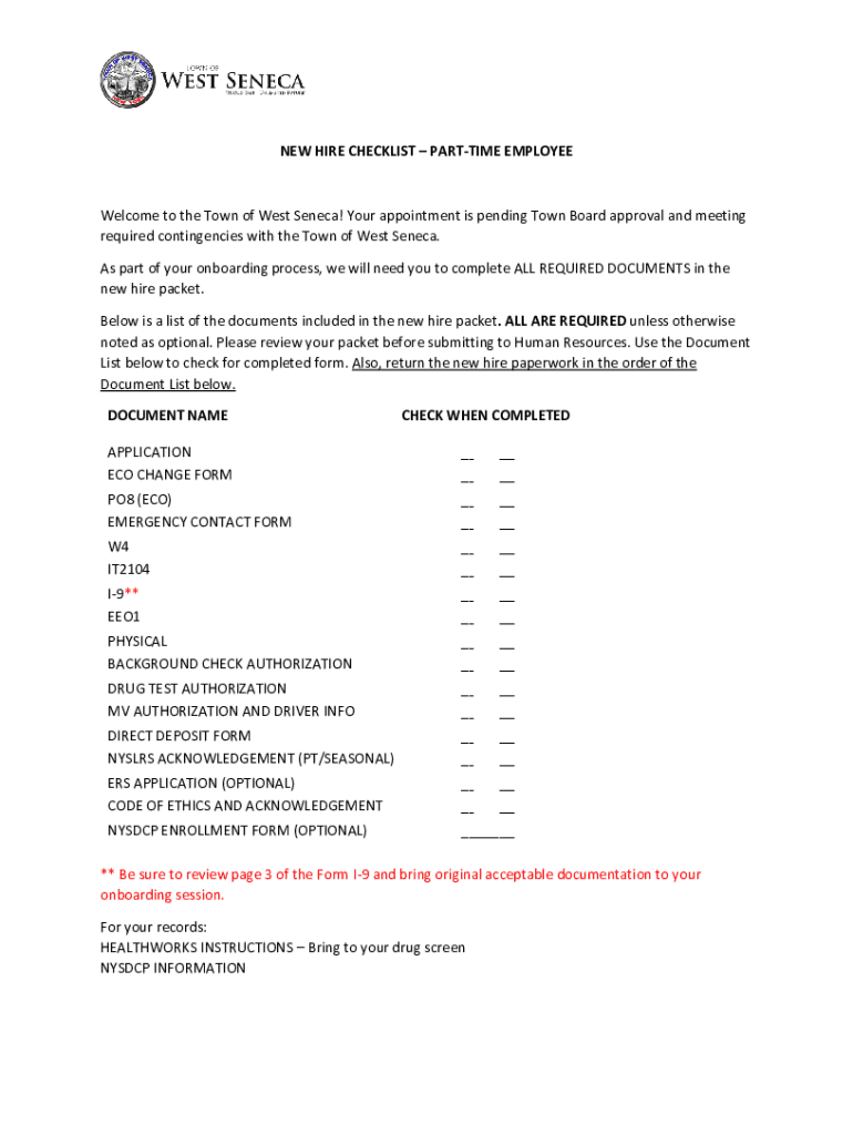 NEW HIRE CHECKLIST PART TIME EMPLOYEEWelcome to the Town of West Seneca! Your appointment is pending Town Board approval and meeting required contingencies with the Town of West Seneca. As part of