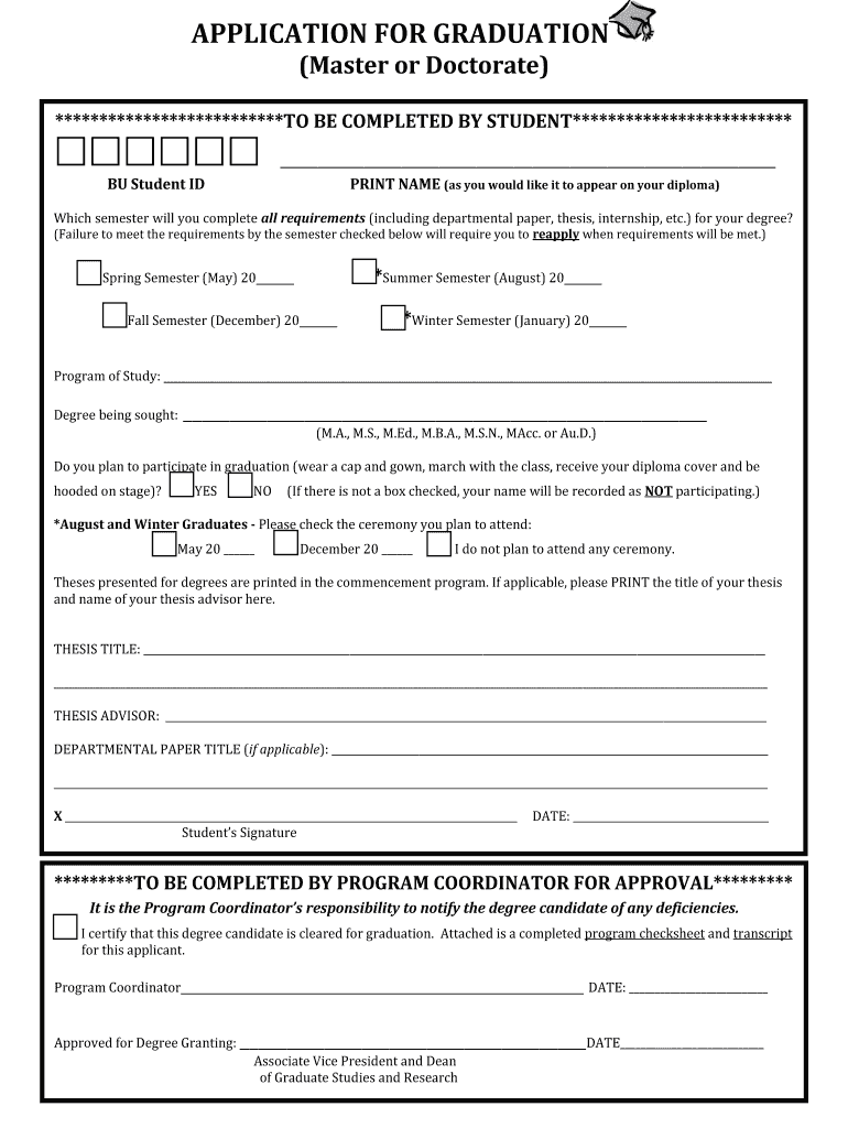 Graduate students who are nearing completion of their programs should utilize this form to guarantee their eligibility for graduation. Completing the Application for Graduation is essential; without it, students risk missing important deadlines and not being able to participate in the graduation ceremony.