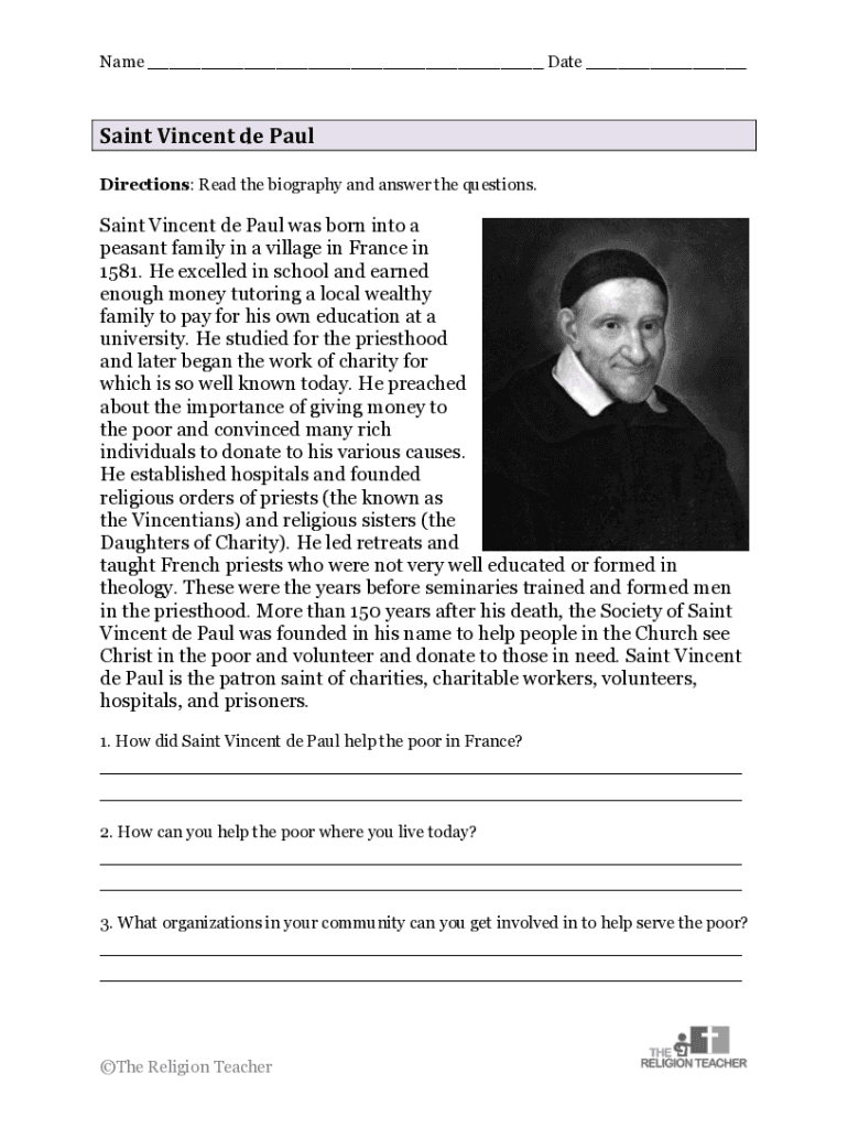 Name ___ Date ___Saint Vincent de PaulDirections: Read the biography and answer the questions. Saint Vincent de Paul was born into a peasant family in a village in France in 1581. He excelled in school