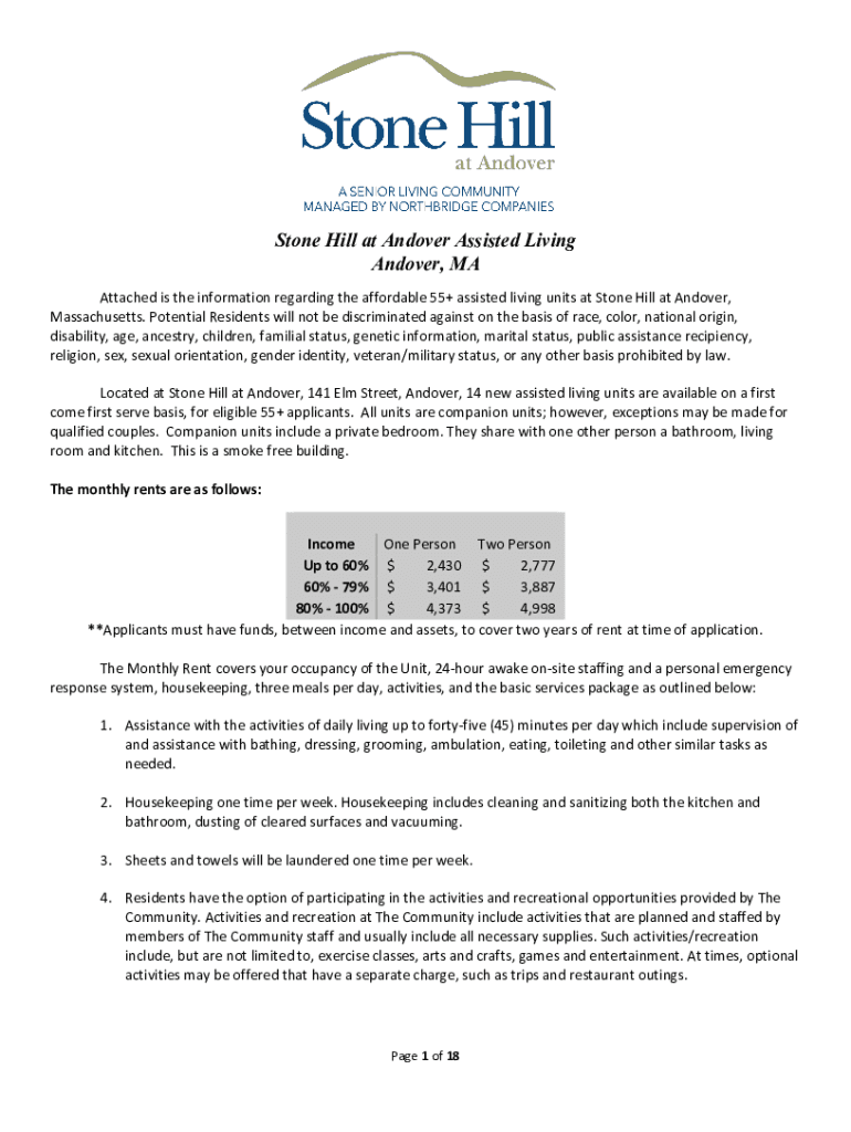 Stone Hill at Andover Assisted Living Andover, MA Attached is the information regarding the affordable 55+ assisted living units at Stone Hill at Andover, Massachusetts. Potential Residents will not