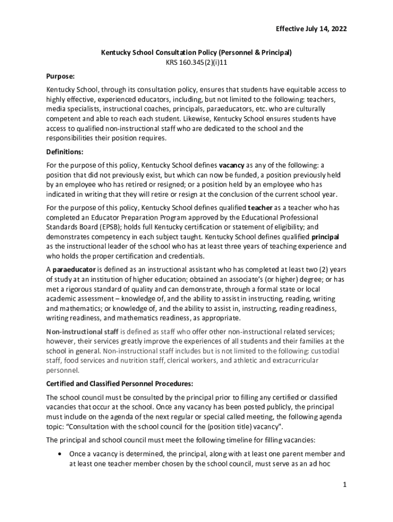 Effective July 14, 2022, Kentucky School Consultation Policy (Personnel & Principal) MRS 160.345(2)(i)11 Purpose: Kentucky School, through its consultation policy, ensures that students have equitable
