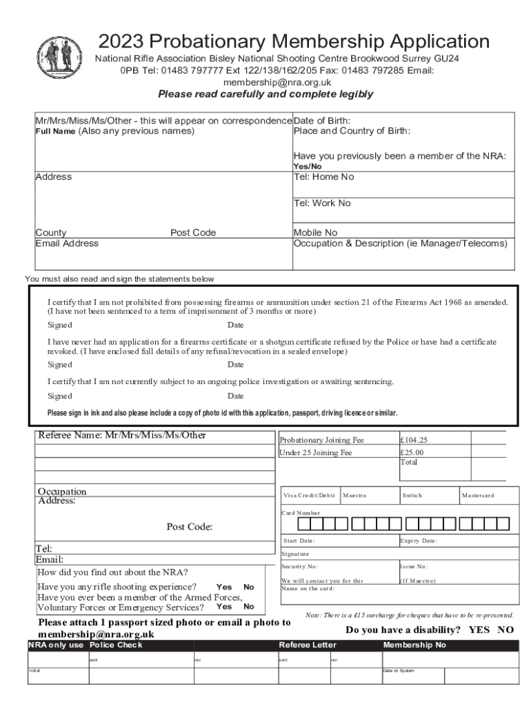 2023 Probationary Membership ApplicationNational Rifle Association Biscay National Shooting Center Brook wood Surrey GU24 0 PB Tel: 01483 797777 Ext 122/138/162/205 Fax: 01483 797285 Email: membership@nra.org.ukPlease