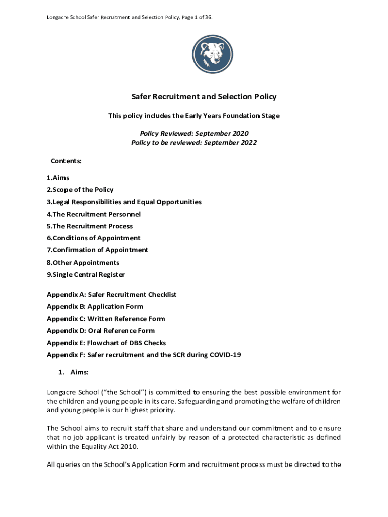 Long acre School Safer Recruitment and Selection Policy, Page 1 of 36. Safer Recruitment and Selection Policy This policy includes the Early Years Foundation Stage Policy Reviewed: September 2020