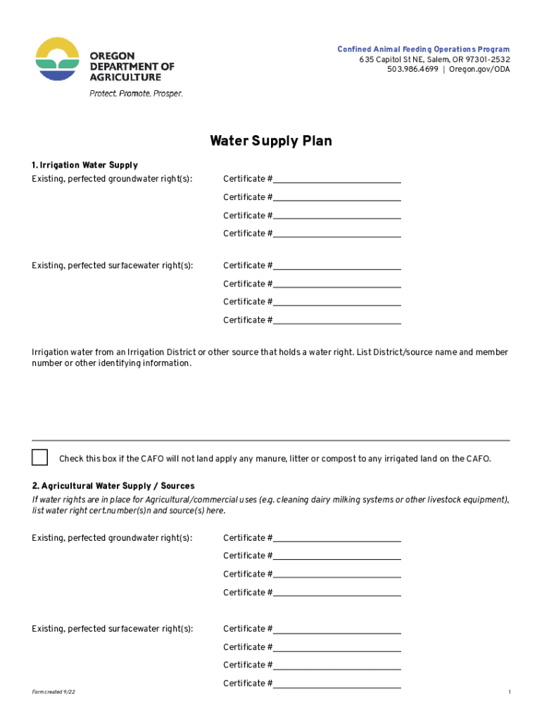 Confined Animal Feeding Operations Program 635 Capitol St NE, Salem, OR 973012532 503.986.4699 | Oregon.gov/ODAWater Supply Plan 1. Irrigation Water Supply Existing, perfected groundwater right(s):Certificate