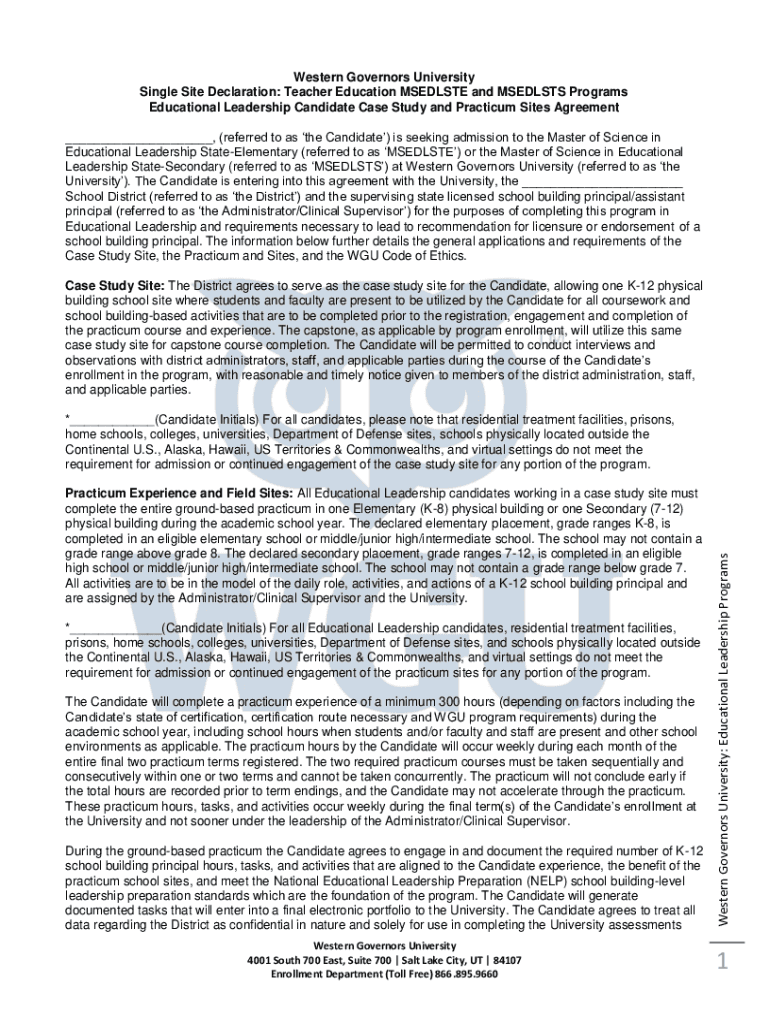 Western Governors University Single Site Declaration: Teacher Education MEDIATE and MELTS Programs Educational Leadership Candidate Case Study and Practicum Sites Agreement ___, (referred to as the
