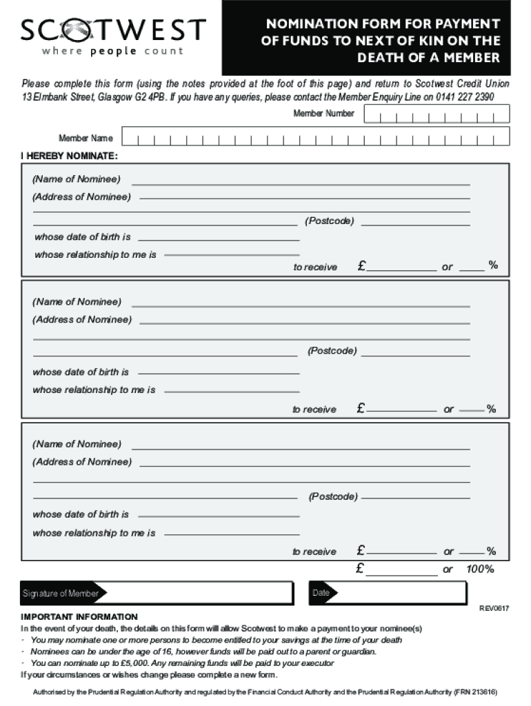 NOMINATION FORM FOR PAYMENT OF FUNDS TO NEXT OF KIN ON THE DEATH OF A MEMBER Please complete this form (using the notes provided at the foot of this page) and return to Scot west Credit Union 13 Embank