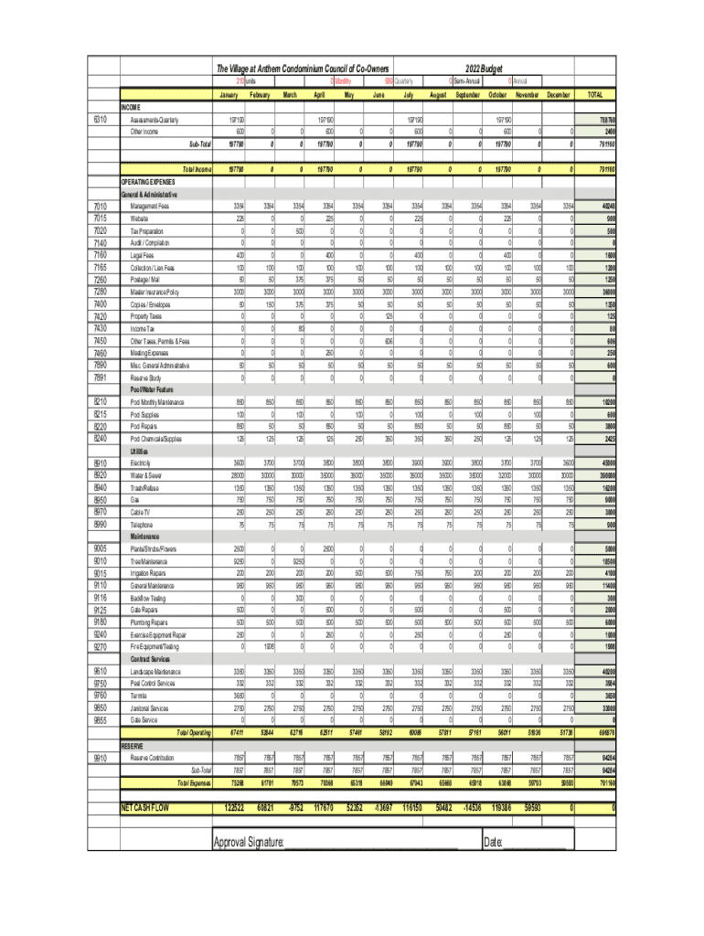 The Village at Anthem Condominium Council of Owners 210 units January0 MonthlyFebruaryMarchApril2022 Budget939 QuarterlyMayJune0 SemiAnnualJulyAugustSeptember0 Annual OctoberNovemberDecemberTOTALINCOME6310AssessmentsQuarterly197190Other