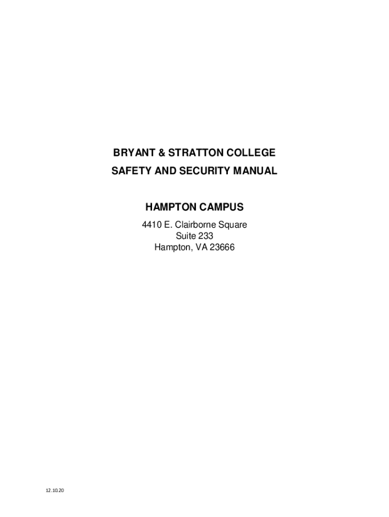 BRYANT & STRATTON COLLEGE SAFETY AND SECURITY MANUALHAMPTON CAMPUS 4410 E. Claiborne Square Suite 233 Hampton, VA 2366612.10.20Table of Contents Crime Prevention Programs...3 Reporting Criminal Actions