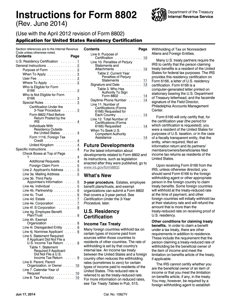 Instructions for Form 8802 Department of the Treasury Internal Revenue Service (Rev. June 2014) (Use with the April 2012 revision of Form 8802) Application for United States Residency Certification