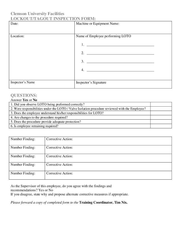 Clemson University Facilities LOCKOUT/RAGOUT INSPECTION FORM: Date:Machine or Equipment Name:Location:Name of Employee performing LOT 1. ___ 2. ___ 3. ___ 4. ___Inspectors NameInspectors SignatureQUESTIONS: