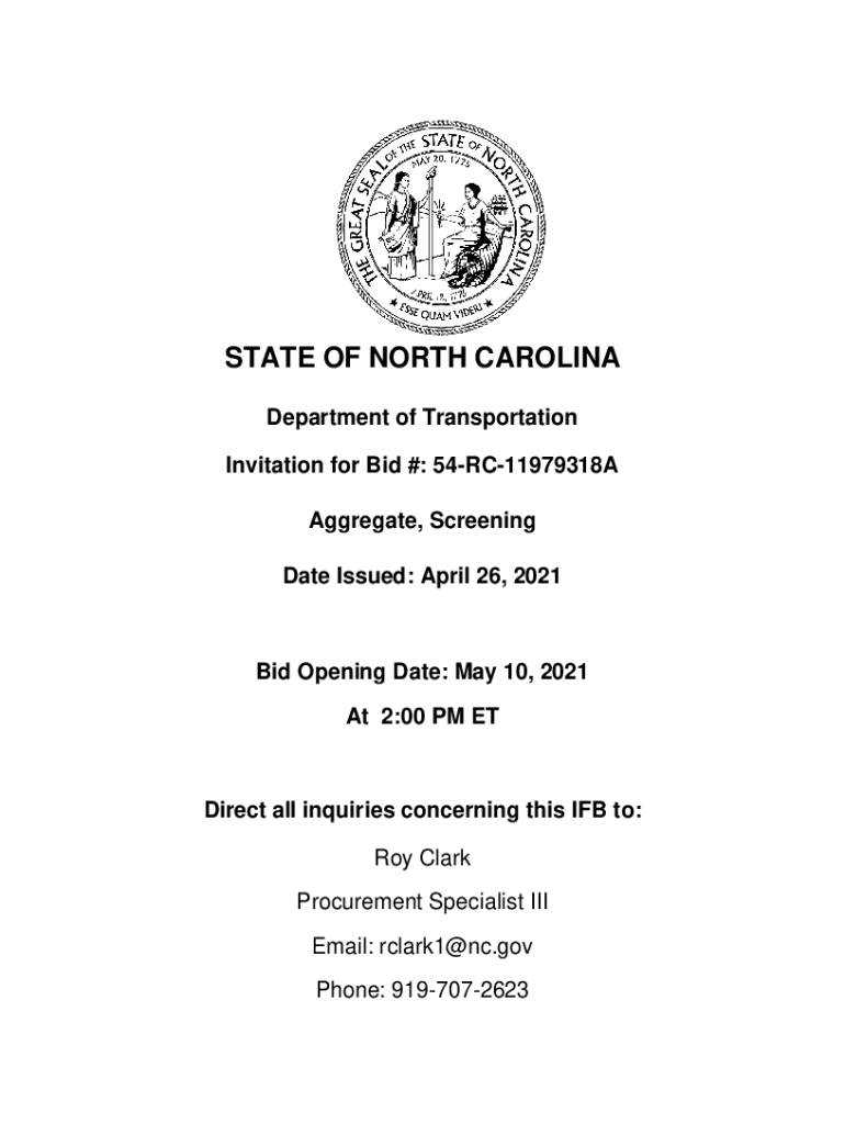 STATE OF NORTH CAROLINA Department of Transportation Invitation for Bid #: 54RC11979318A Aggregate, Screening Date Issued: April 26, 2021Bid Opening Date: May 10, 2021, At 2:00 PM Direct all inquiries