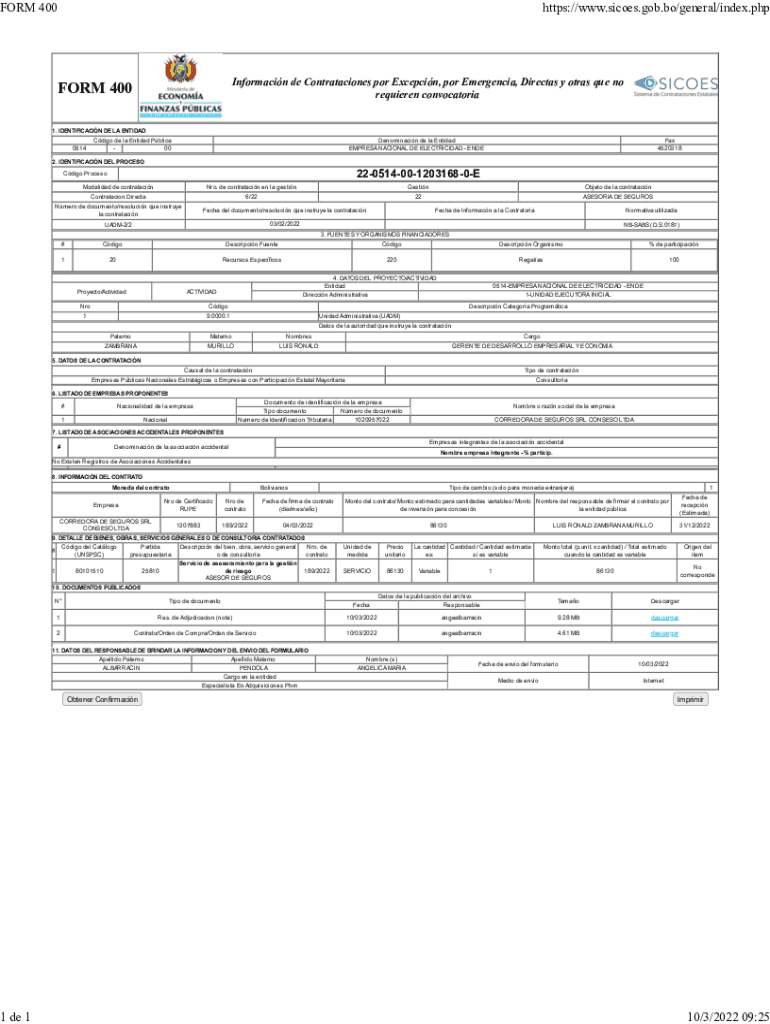 FORM 4001 de 1https://www.sicoes.gob.bo/general/index.phpInformacin de Contrataciones POR Exception, POR Emergency, Directs y okras Que now
