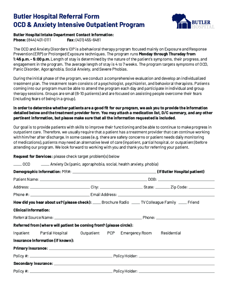 Butler Hospital Referral Form OCD & Anxiety Intensive Outpatient Program Butler Hospital Intake Department Contact Information: Phone: (844) 4010111Fax: (401) 4556481The OCD and Anxiety Disorders