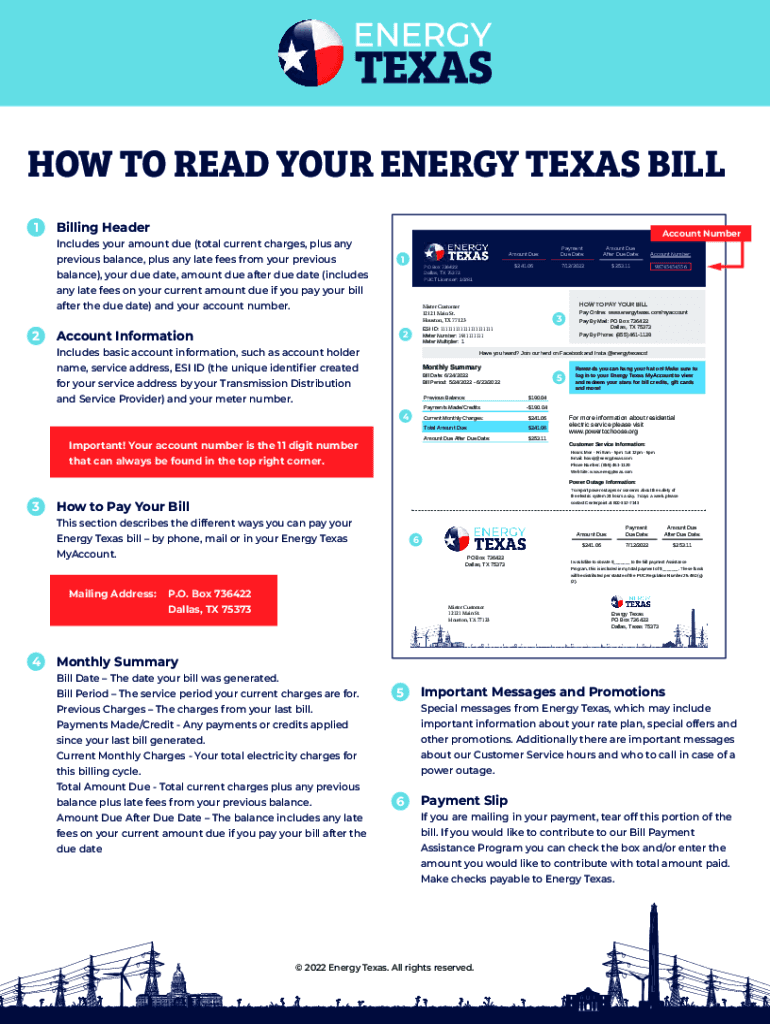 HOW TO READ YOUR ENERGY TEXAS BILL 1Billing Header Includes your amount due (total current charges, plus any previous balance, plus any late fees from your previous balance), your due date, amount