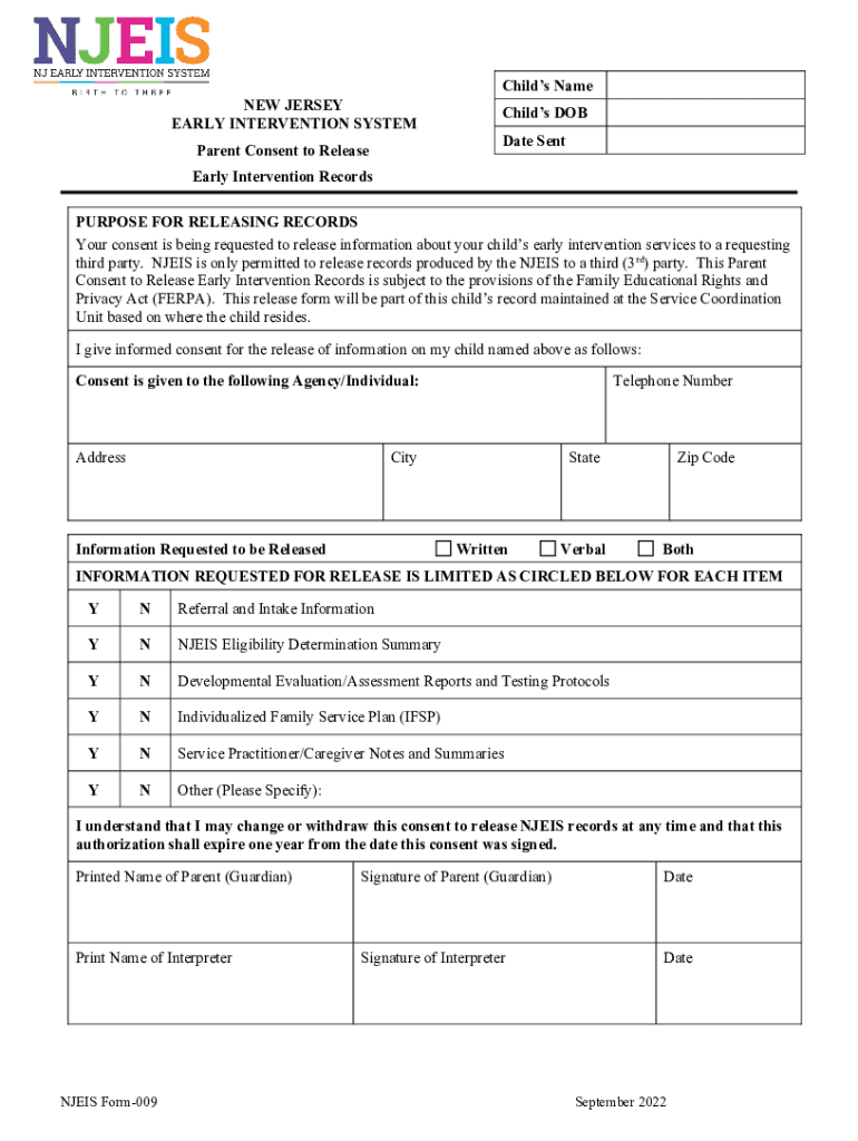 NEW JERSEY EARLY INTERVENTION SYSTEM Parent Consent to ReleaseChilds Name Child's DOB Date Nearly Intervention Records PURPOSE FOR RELEASING RECORDS Your consent is being requested to release information