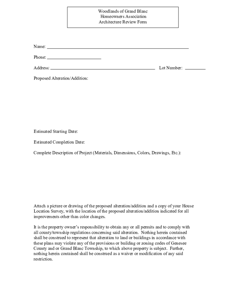Woodlands of Grand Blanc Homeowners Association Architecture Review Forename: Phone: Address:Lot Number:Proposed Alteration/Addition:Estimated Starting Date: Estimated Completion Date: Complete Description