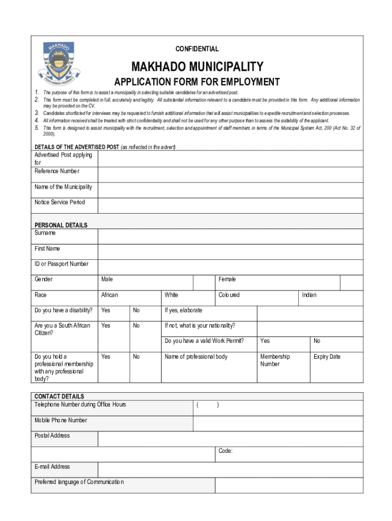 CONFIDENTIALMAKHADO MUNICIPALITY APPLICATION FORM FOR EMPLOYMENT 1. The purpose of this form is to assist a municipality in selecting suitable candidates for an advertised post. 2. This form must