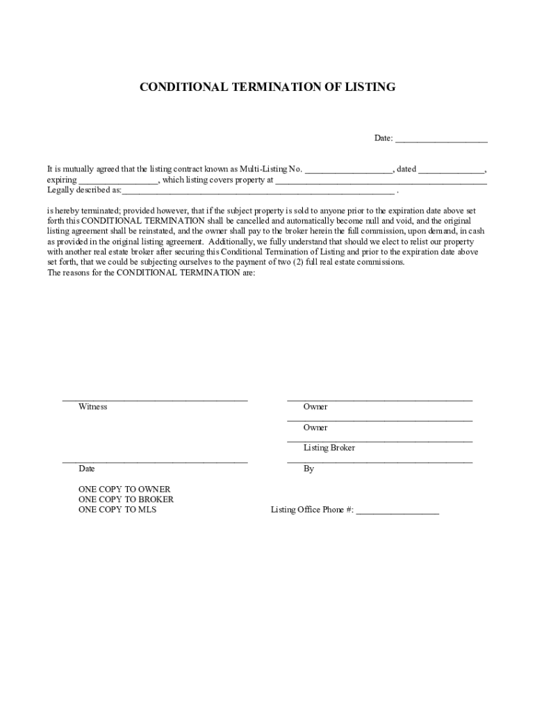 CONDITIONAL TERMINATION OF Litigate: ___ It is mutually agreed that the listing contract known as Multicasting No. ___, dated ___, expiring ___, which listing covers property at ___ Legally described
