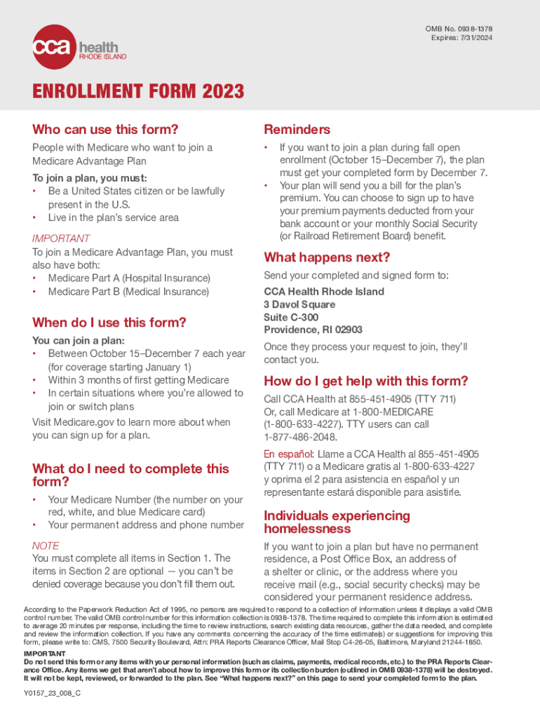 OMB No. 09381378 Expires: 7/31/2024ENROLLMENT FORM 2023 Who can use this form? People with Medicare who want to join a Medicare Advantage Plan To join a plan, you must: Be a United States citizen