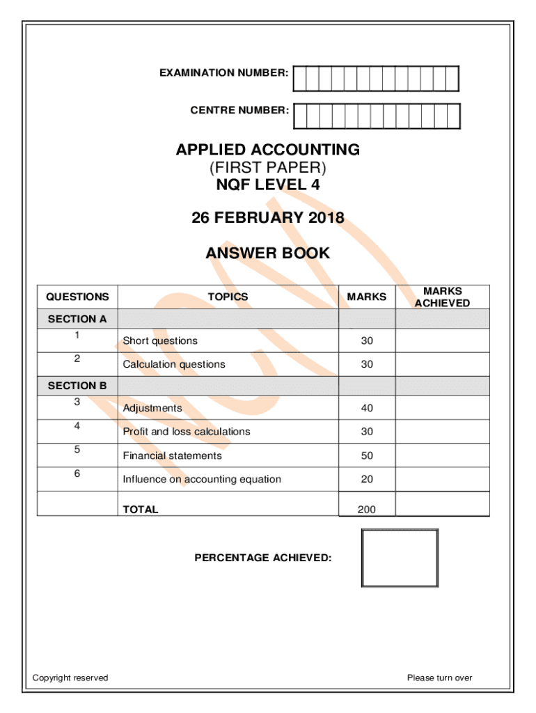 EXAMINATION NUMBER:Center NUMBER:APPLIED ACCOUNTING (FIRST PAPER) NSF LEVEL 4 26 FEBRUARY 2018 ANSWER BOOK QUESTIONSTOPICSMARKSMARKS ACHIEVEDSECTION A 1 2Short questions30Calculation questions30Adjustments40Profit