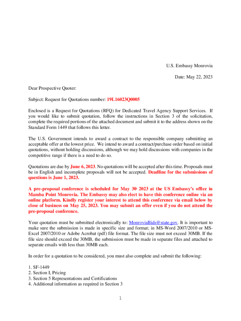 U.S. Embassy Monrovia Date: May 22, 2023, Dear Prospective Quoted: Subject: Request for Quotations number: 19L16023Q0005 Enclosed is a Request for Quotations (RFQ) for Dedicated Travel Agency Support