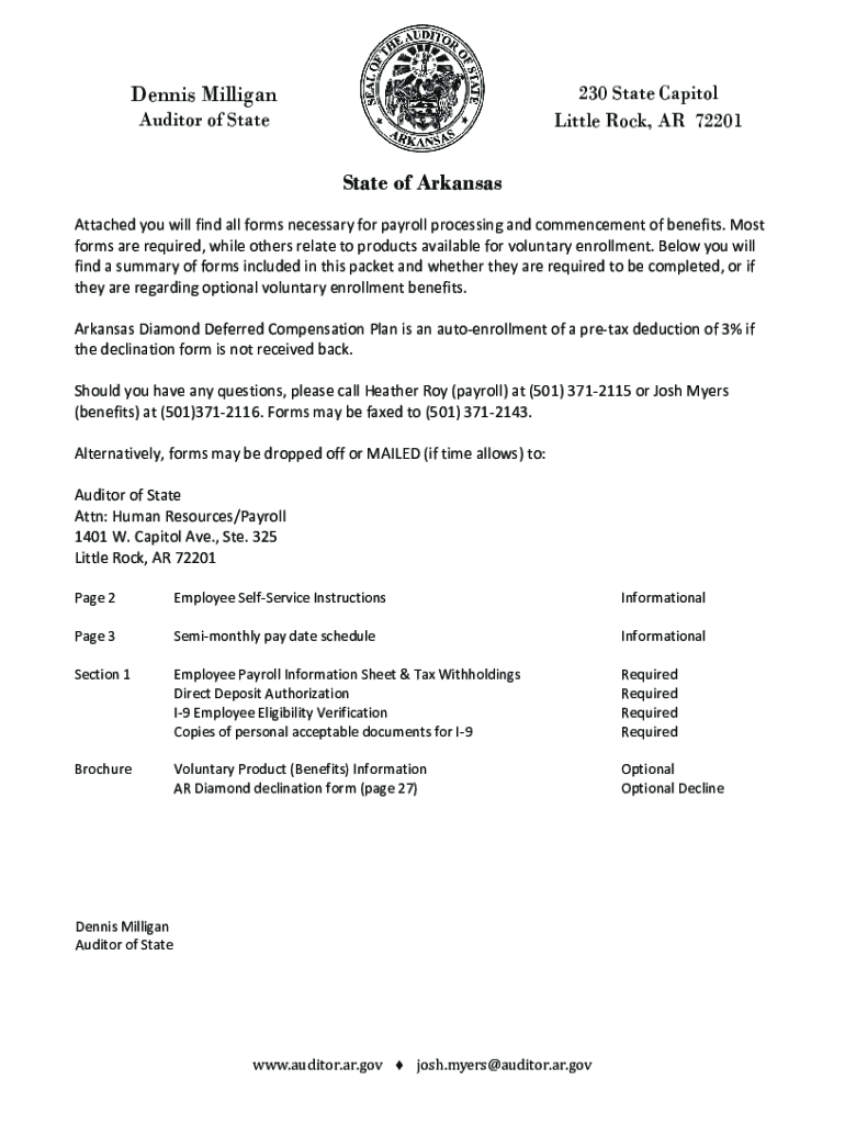 Dennis Milligan230 State Capitol Little Rock, AR 72201Auditor of Statesman of Arkansas Attached you will find all forms necessary for payroll processing and commencement of benefits. Most forms are