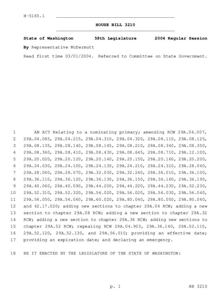H5165.1___ HOUSE BILL 3210 ___State of Washington58th Legislature2004 Regular Session Representative McDermott Read first time 03/01/2004. Referred to Committee on State Government.1 2 3 4 5 6 7 8