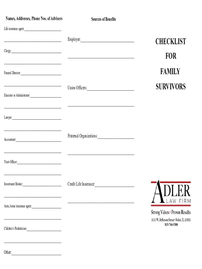 Names, Addresses, Phone Nos. Of AdvisersSources of BenefitsLife insurance agent:___ ___ Clergy:___Employer:___CHECKLIST___FOR___FAMILYFuneral Director:___ ___Union Officers:___SURVIVORSExecutor or