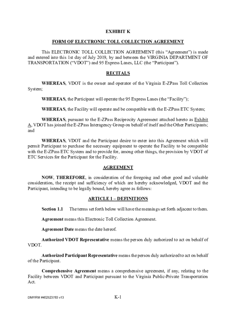 EXHIBIT K FORM OF ELECTRONIC TOLL COLLECTION AGREEMENT This ELECTRONIC TOLL COLLECTION AGREEMENT (this Agreement) is made and entered into this 1st day of July 2019, by and between the VIRGINIA DEPARTMENT