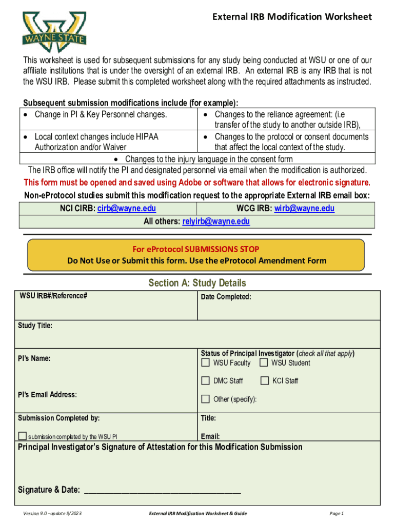 External IRB Modification Worksheets worksheet is used for subsequent submissions for any study being conducted at WSU or one of our affiliate institutions that is under the oversight of an external