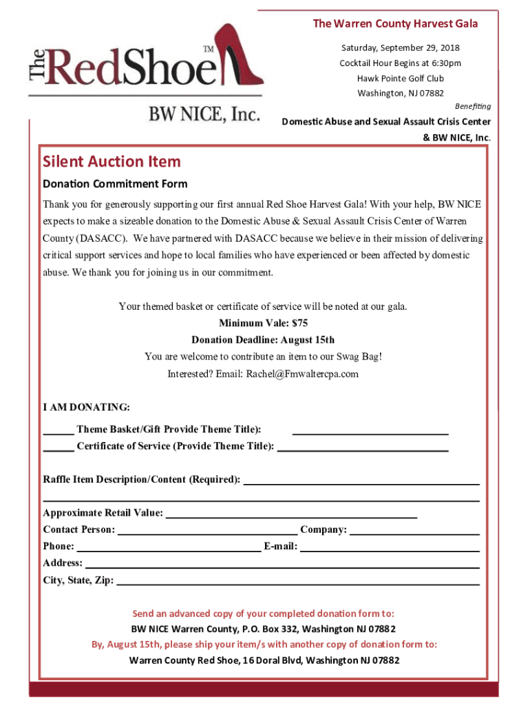 The Warren County Harvest Gala Saturday, September 29, 2018, Cocktail Hour Begins at 6:30pm Hawk Point Golf Club Washington, NJ 07882 BenefitingDomestic Abuse and Sexual Assault Crisis Center & BY