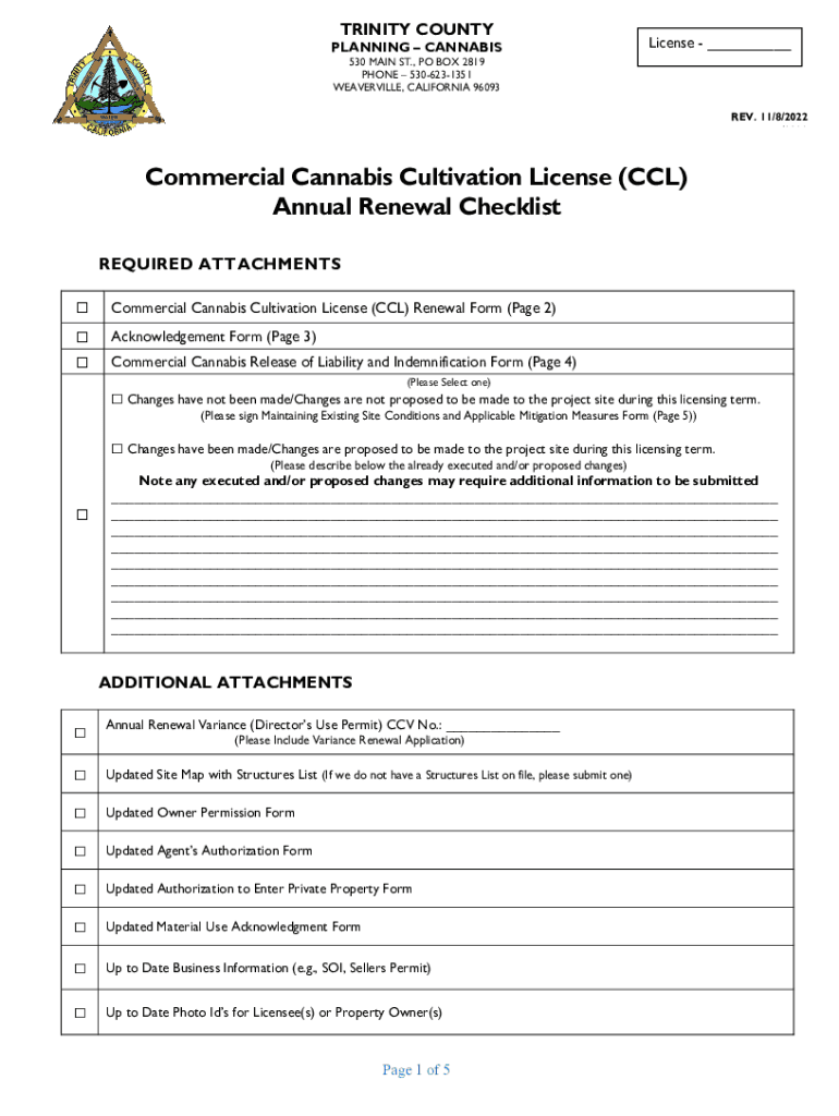 TRINITY COUNTY PLANNING CANNABISLicense ___530 MAIN ST., PO BOX 2819 PHONE 5306231351 WATERVILLE, CALIFORNIA 96093REV. 11/8/2022 /2022Commercial Cannabis Cultivation License (CCL) Annual Renewal Checklist